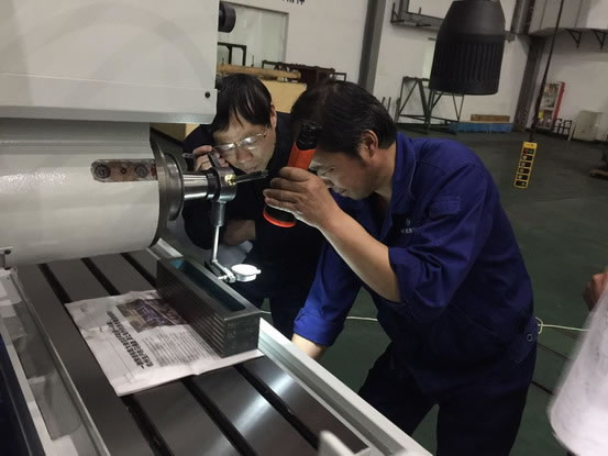 圖為專家在杭機(jī)股份現(xiàn)場(chǎng)抽查M7132H臥軸矩臺(tái)平面磨床的幾何精度
