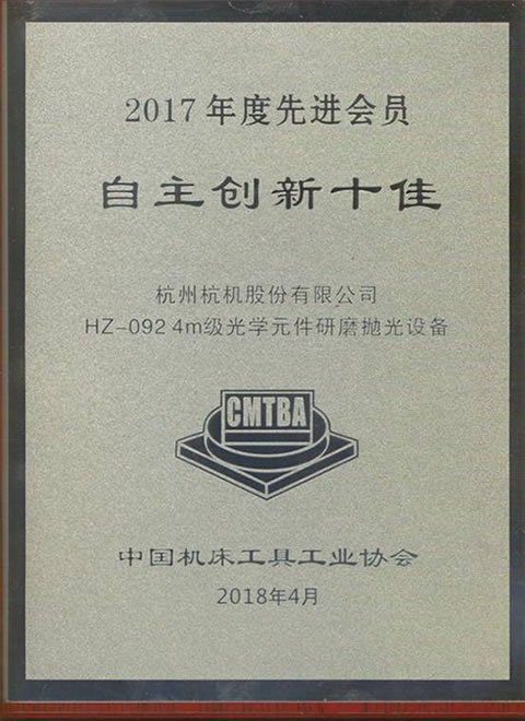 2018年4月,中國機床工具工業(yè)協(xié)會開展了2017年度中國機床工具工業(yè)協(xié)會先進會員(十佳)表彰活動,我公司憑借“HZ-092 4米級光學元件研磨拋光設備”項目榮獲2017年度中國機床工具工業(yè)協(xié)會“自主創(chuàng)新十佳”稱號。